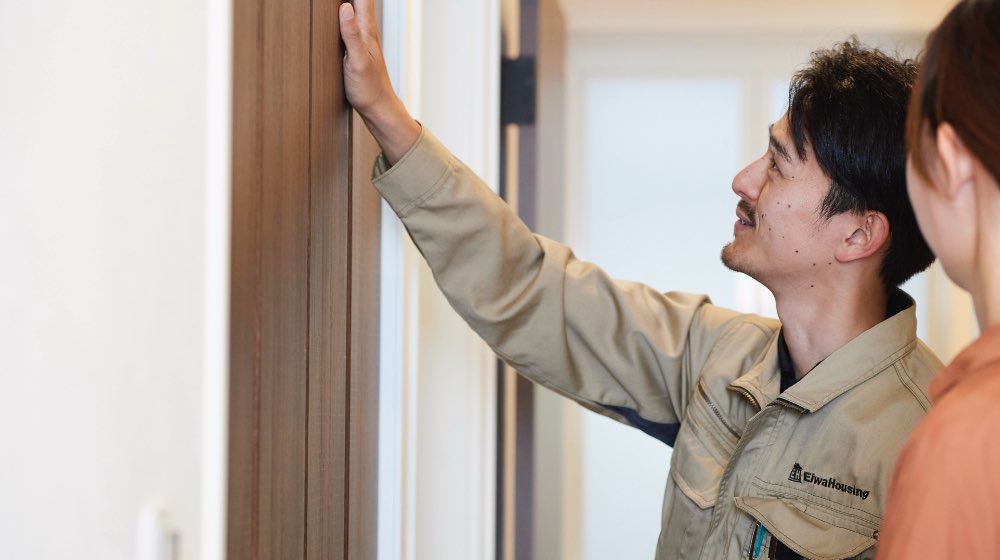 自社一貫体制は、エイワハウジングの強みのひとつ。想いがきちんと現場まで伝わってこそ、家族の夢が詰まったオンリーワンの住まいを建てることができます。家族が安心・快適に暮らせるように、構造躯体も細部までこだわってエイワブランドとして誇れる品質を。現場での学びを重ね、共有し、研鑽を続けながら、家族の想いをより高いレベルで実現できる施工品質を追求し続けます。