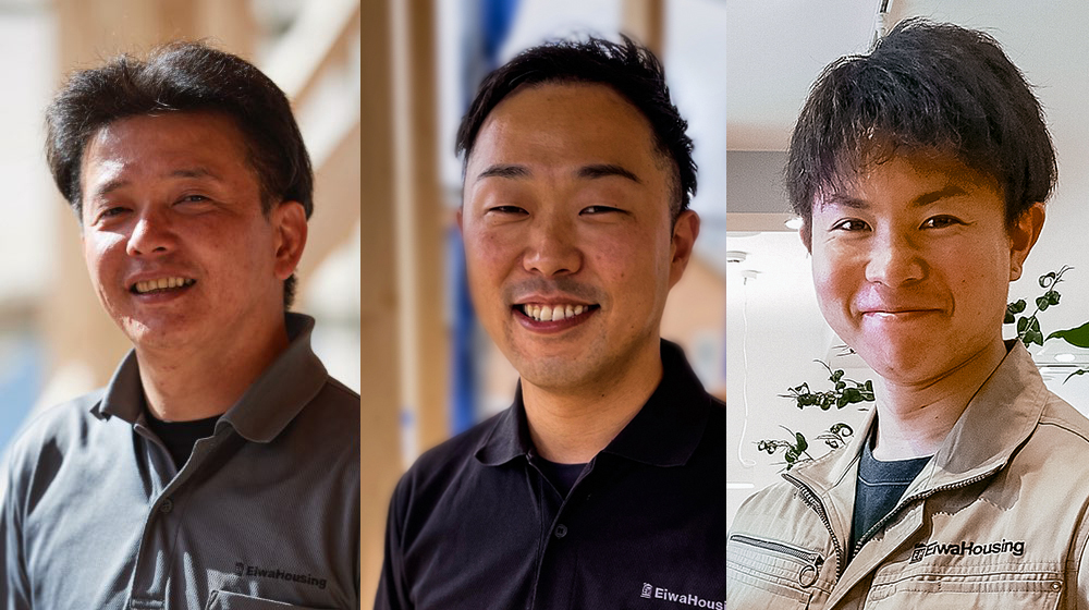それぞれが空間設計やデザインなど、得意とする分野を持つ、個性豊かなエイワハウジングの設計士たち。共通するのは、家づくりが好き、という想いです。設計のプロとして、家族の理想を実現できる方法を考え抜き、どうすれば光が入るか、将来的な変化にも対応できるか、家族の暮らしを想像しながら検討を重ねる。家族と一緒に私たちも楽しみながら、世界にひとつの住まいをカタチにしていきます。