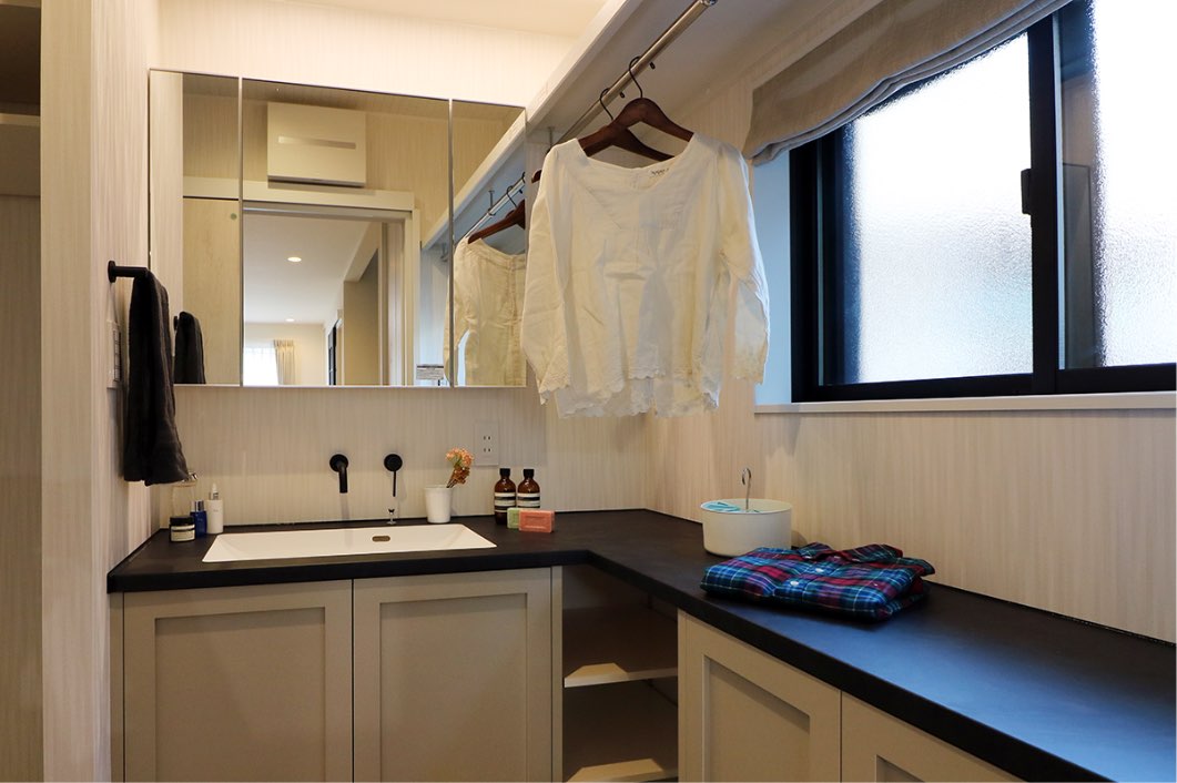 カウンターのデザイン、水栓、洗面室の使い方、扉の色から形にいたるまでとことんこがわった洗面台。顔や手洗ったり、家事をしたり、毎日使うものだからこそ、お気に入りの空間に。