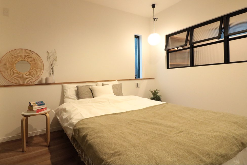 造り付けのベットボードに、間接照明がリラックスをさそう主寝室。アクセントになった室内窓の向こう側には、半個室の書斎スペースを設けました。別々の場所にいても、お互いの気配を感じながら、趣味に仕事に集中できそうです。