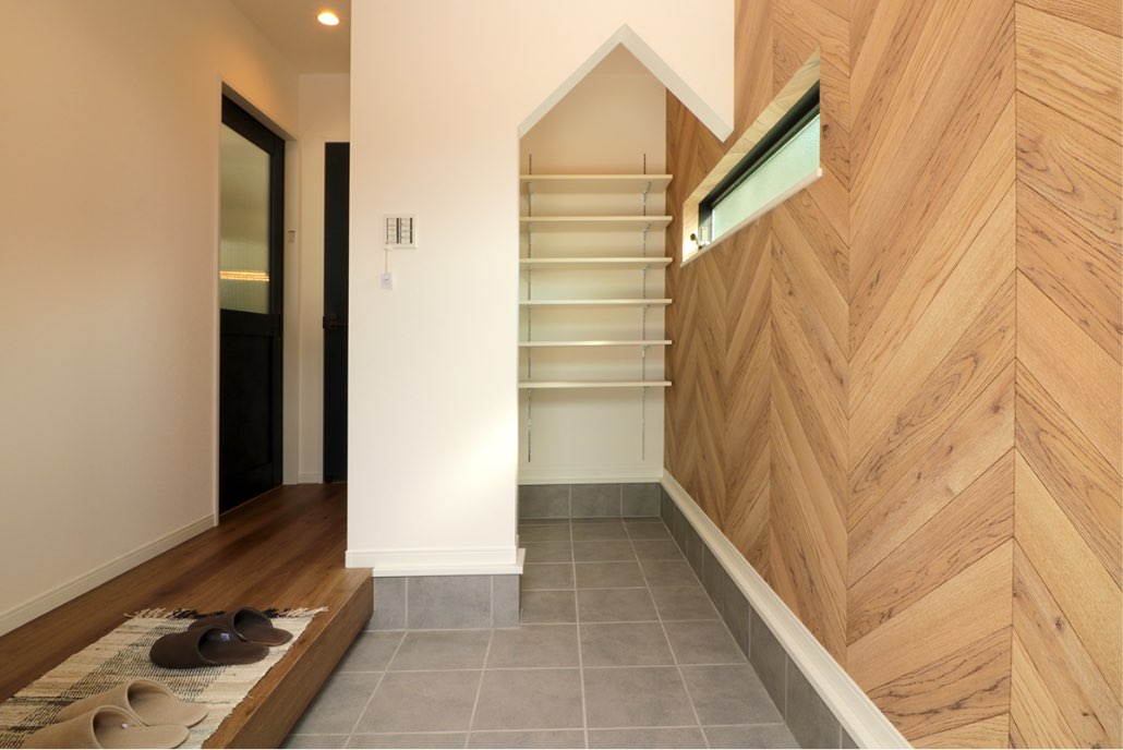 たくさんの人が出入りする玄関は、見た目も大切。玄関とシューズクロークを三角の垂れ壁で空間をゆるやかに仕切り、玄関からシューズクロークまで続く木目調のアクセントクロスでかっこいい雰囲気に仕上げました。