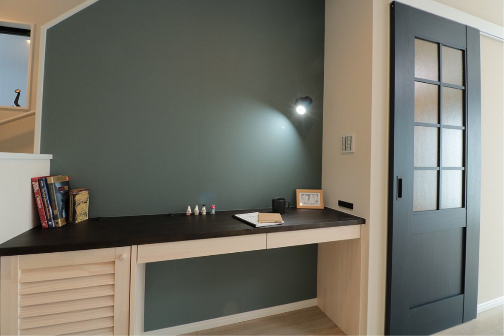 ダイニングの脇には、キッチンからも目が届く、無垢材のカウンタースペースを。アイロンをかけたり、子供の勉強を一緒に見たりと、用途を絞り込まず、親も子どもも様々な使い方ができるスペースです。