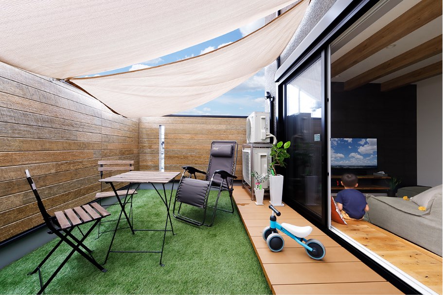 人目を気にすることなくのびのびと過ごせる、都会とは思えない、光と風が心地よいアウトドアリビング。リビング側は少し立ち上げ、外にはデッキを設けることでフラットになり、リビングと一体感を演出しました。