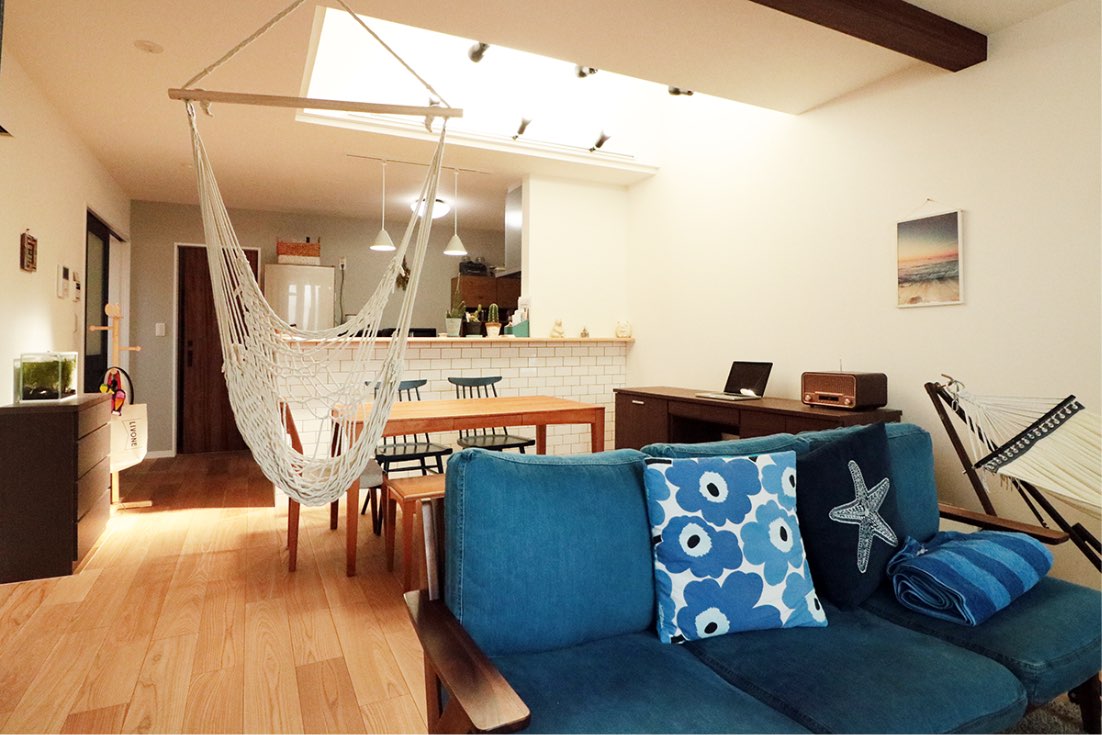 ゆとりある広さのLDKに、吹抜けから柔らかな光がふりそそぐダイニング。お気に入りのインテリアに囲まれたリビングで、ハンモックに揺られながら、充実したリラックスタイムを楽しんで。