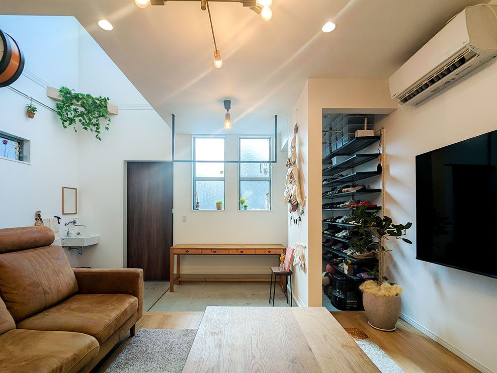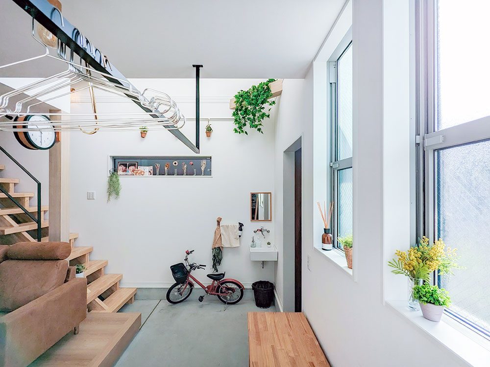 広くとった玄関土間には、室内物干しスペースもあり、家事ラクに。