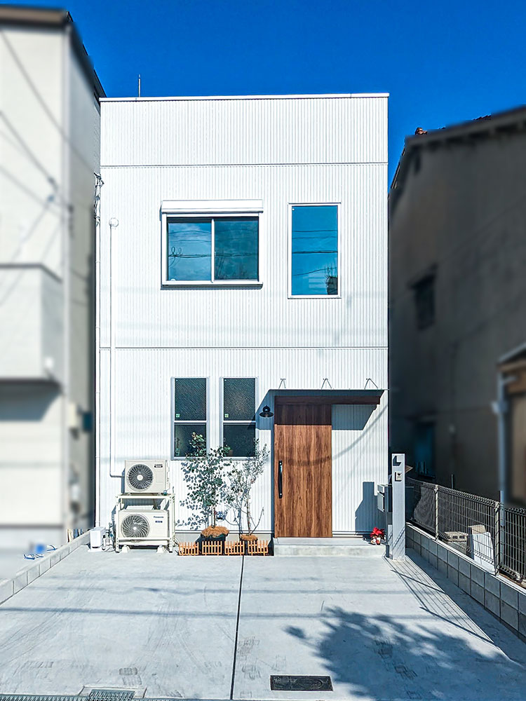 大きな窓が印象的な、ホワイト×木のシンプルな外観。