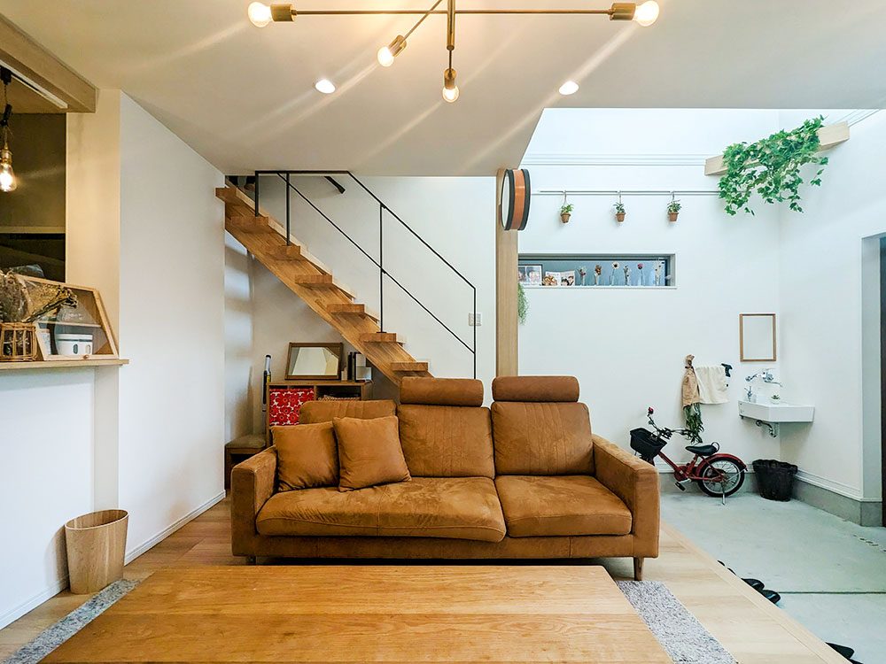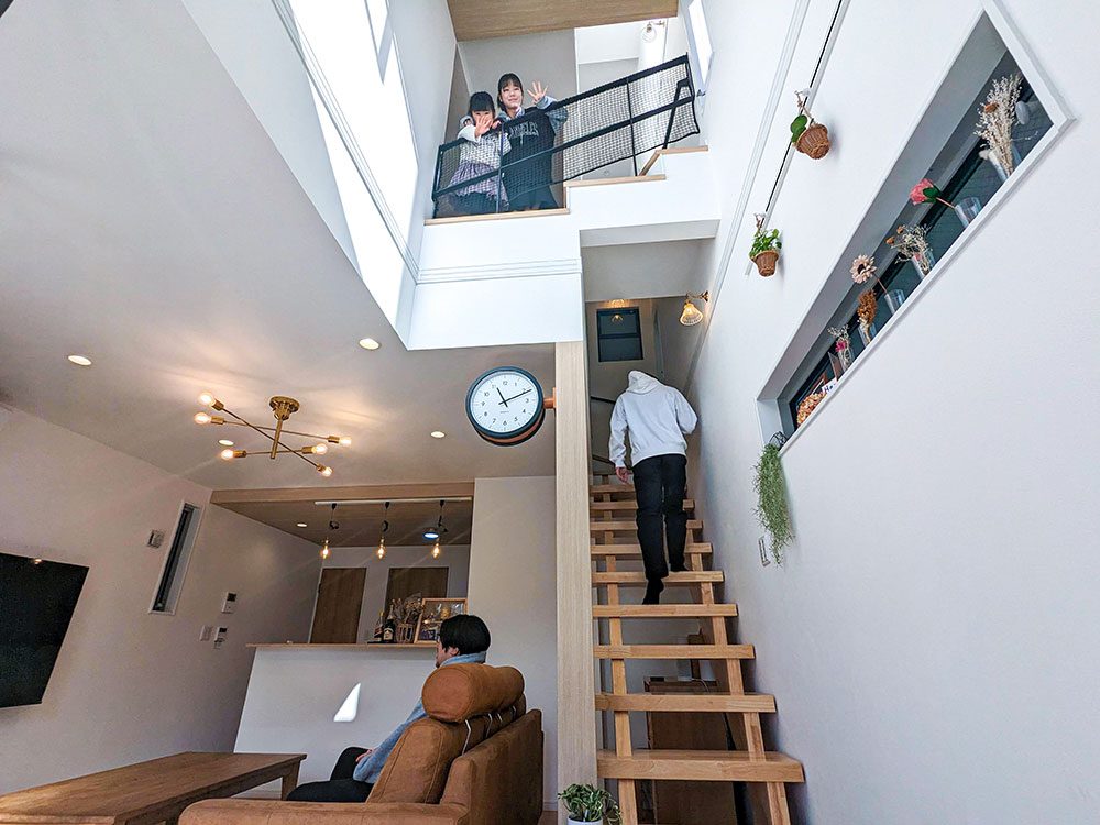 お家に入るとすぐに、開放感ある明るいリビングが。上階にいる子供たちの楽しそうな声が聞こえる、繋がりある空間に。
