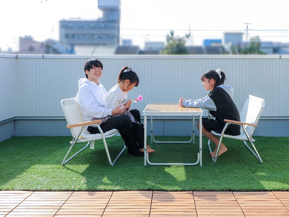 あと、3階のルーフバルコニー。夜にちょっとたそがれたり、子供たちの遊びスペースにもなっています。子供たちとプールがしたいといった、ちょっとした夢があったのですが、今年の夏に大きなビニールプールを出して遊ぶことができ、夢が叶った!って思いましたね。