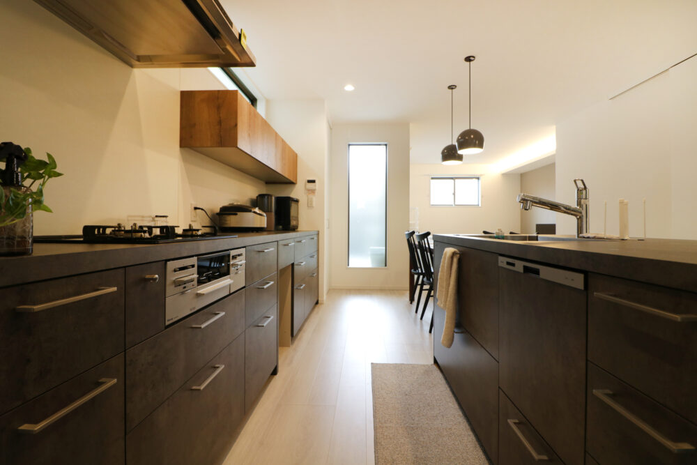 キッチンも嬉しかったですね。稲田さんからこういったキッチンを入れますよ!と推しポイントで挙げていただいて。たしかにいいな~と思って!モデルハウスだと普通は白いキッチンのイメージがあったのですが、「色もかっこいいな~」と親とも話してました。お客さんを呼んだ時にも「かっこいいね」と言ってもらえて嬉しいです。あと、収納がすごく多くて。なんでも隠せるし、料理をするスペースも広くて、いっぱい物を出しても広々してるから、どこにどう置こうとか困ったことはないですね。