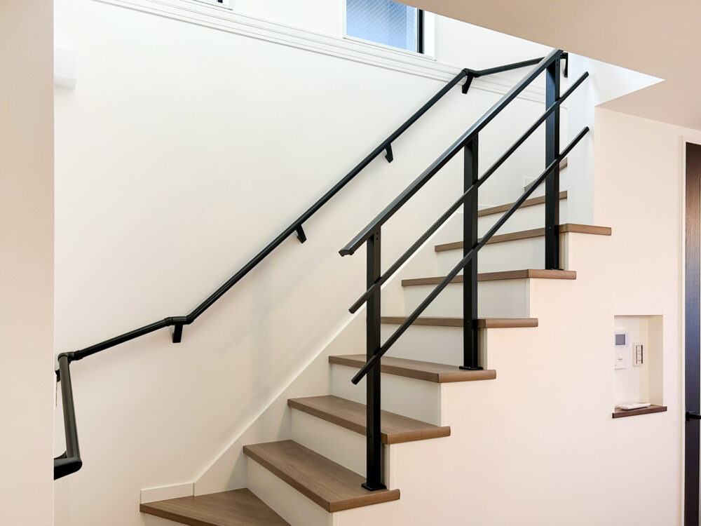 こだわりの吹抜け階段×横桟手すり。階段を上がると扉があり、においや音を遮断。