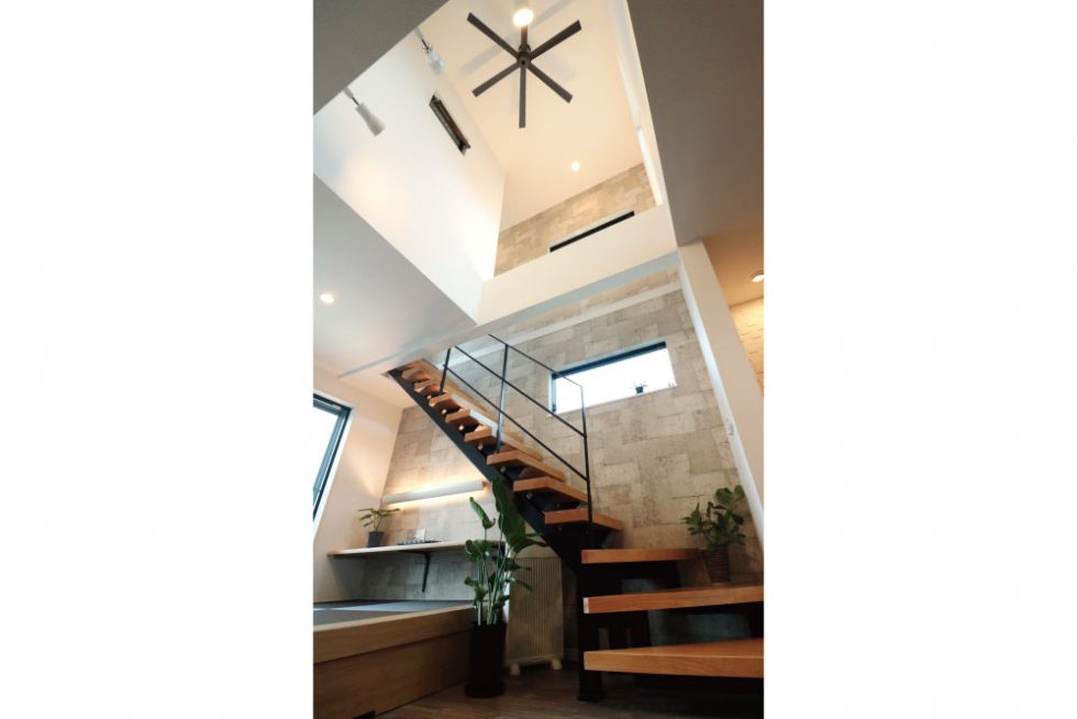 3階へと繋がる、お家の顔となっているシンボリックな鉄骨階段と吹抜け