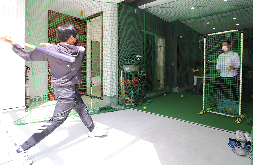 親子で仲良くトスバッティング。思い切りバッドを振ってもネットがあるので安心です。