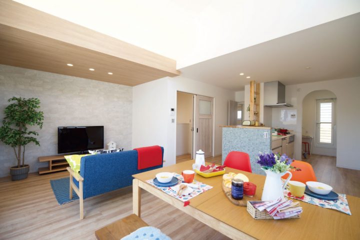 白や木目を基調としたナチュラルで優しい空間に、壁紙等で程よいアクセントを取り入れた北欧テイストのお家です。勾配天井のリビングは明るく開放感があり、自然と家族が集まりそうです。またリビングからキッチン、キッチンから洗面室へとつながっており、料理や洗濯をスムーズに出来る家事動線を意識しました。キッチン・トイレに造作した、ニッチや棚等にお気に入りの雑貨や、本を飾って見せる収納で、毎日の暮らしが更に楽しくなるはず。