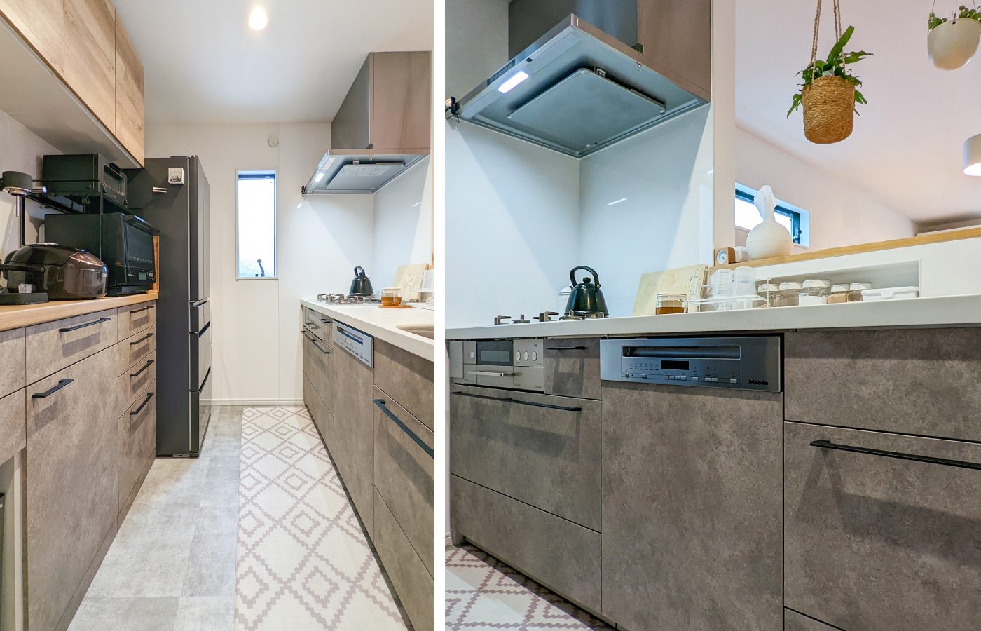 何度もショールームに足を運び、色にもこだわったミーレの食洗器が入ったキッチン。フロアタイルやその見切りを真鍮にしたこともこだわりです。