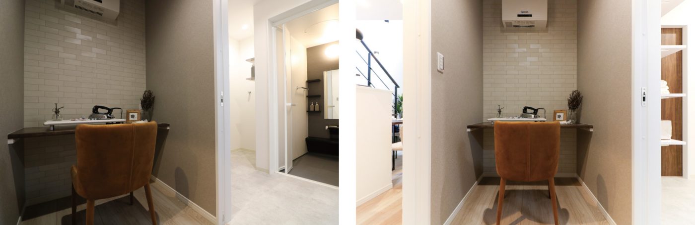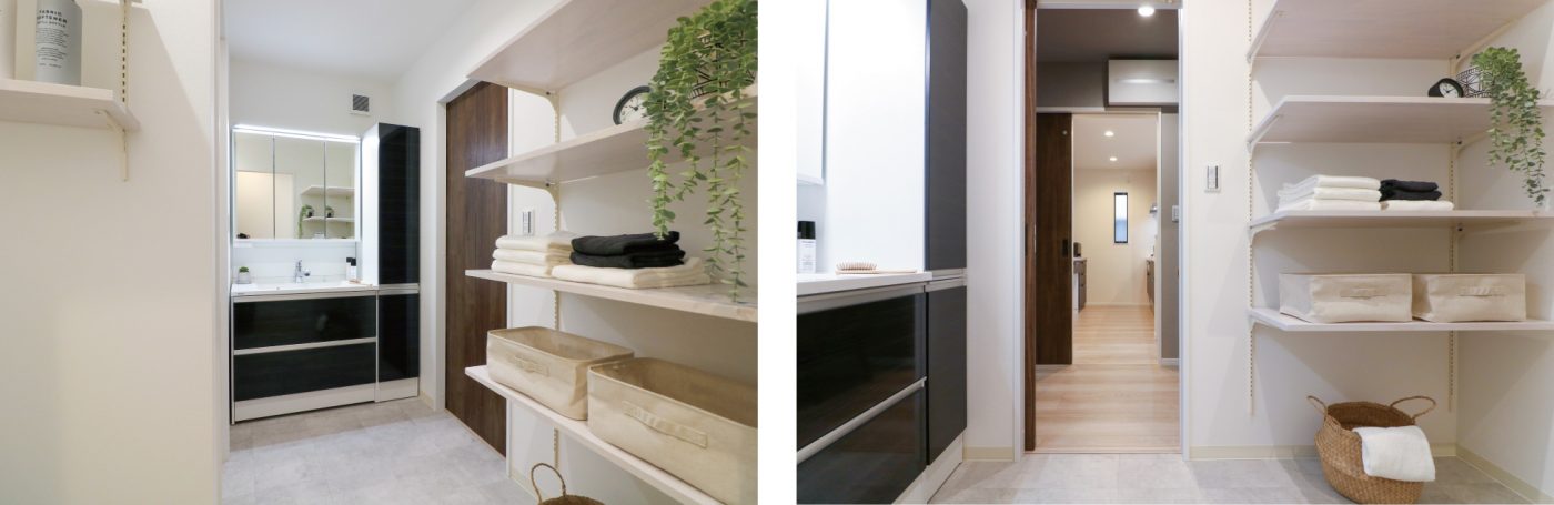 玄関とランドリールームへつながる、可動棚収納たっぷりの2way洗面室。
