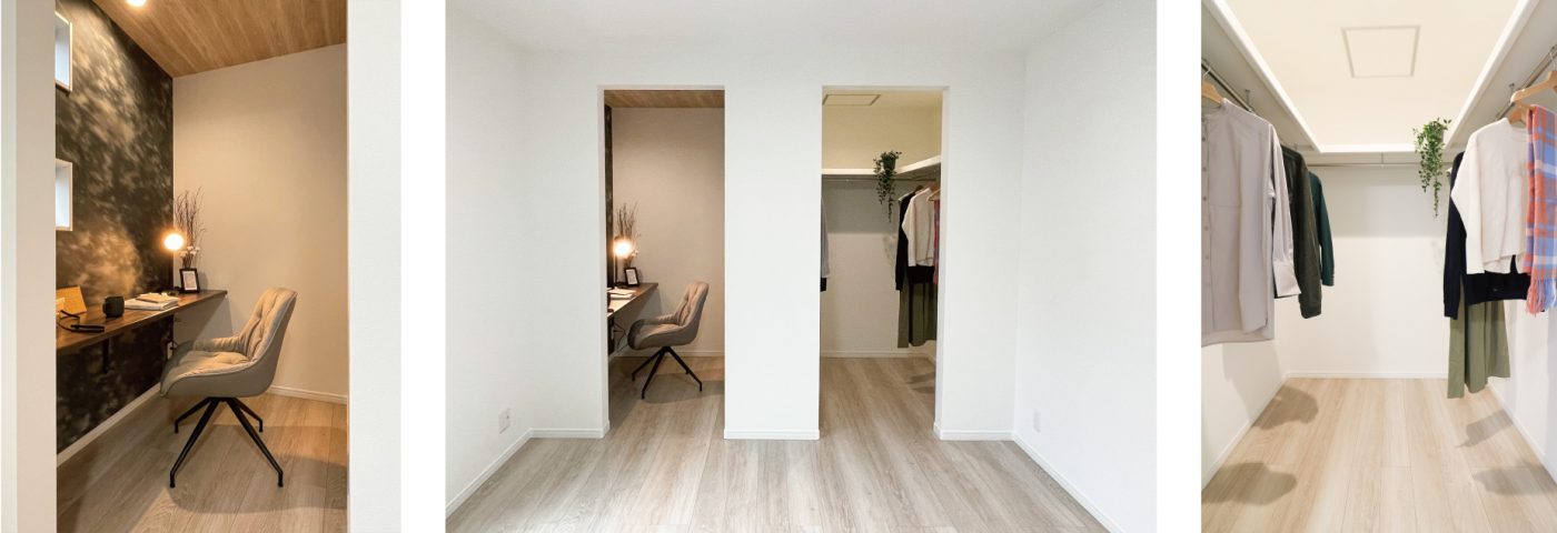 書斎とWICを設けた主寝室。書斎には造作カウンターとコンセントを設け、在宅ワークなど篭れる空間に。