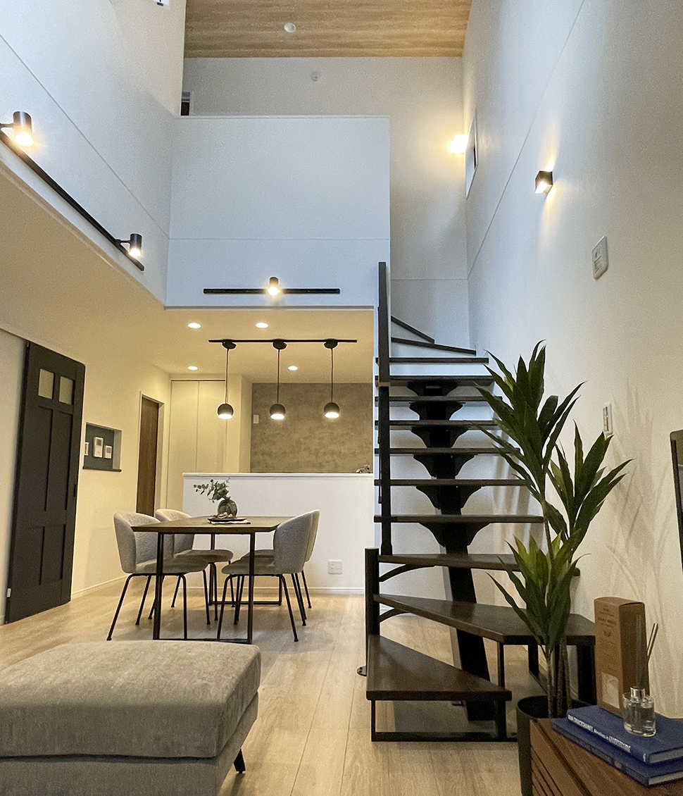 照明器具や家具のアイアン・鉄骨階段など、所々にブラックを加え、空間を引き締めたモダンなLDK。