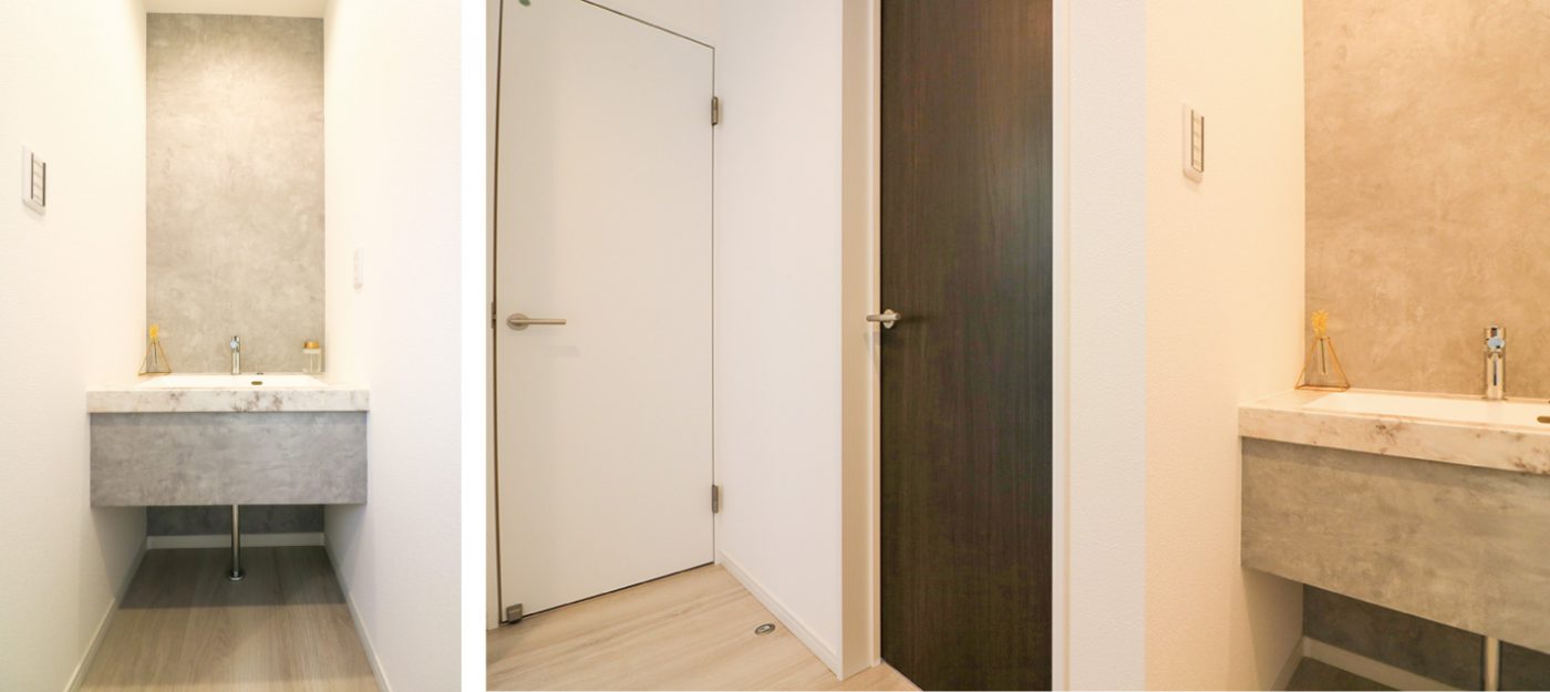 配管が見えにくい様に前幕板を造り、壁面と同じアクセントクロスを貼り統一感をもたせました。