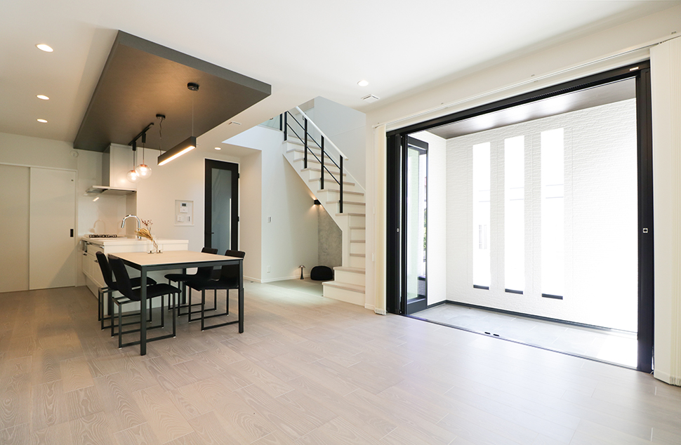 ダイニングキッチン横に吹き抜け階段を設け、空間に開放感を取り入れました。