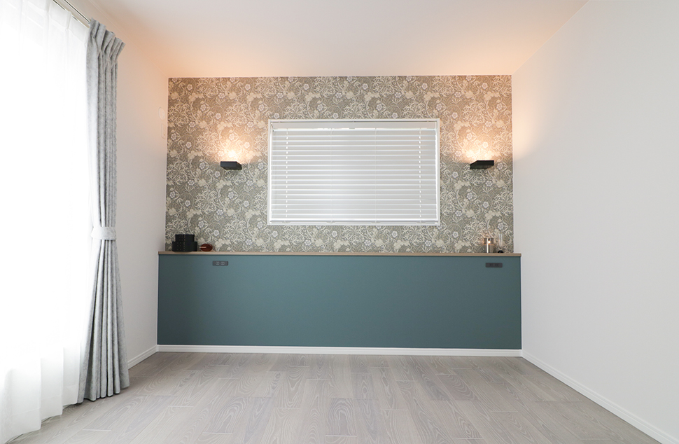 ブラケットライトを左右に取付け、ホテルライクな空間に。ウィリアムモリスの柄物クロスとそれに合わせた単色クロスを上下に貼り分けました。そこに、ホワイト木目のウッドブラインドを重ね、シックで落ち着いた印象に。