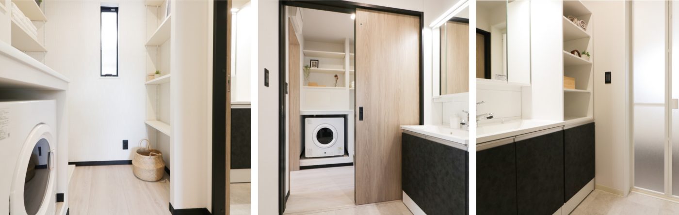 キッチンとLDKへ繋がる回遊動線を取り入れたランドリーと洗面室。