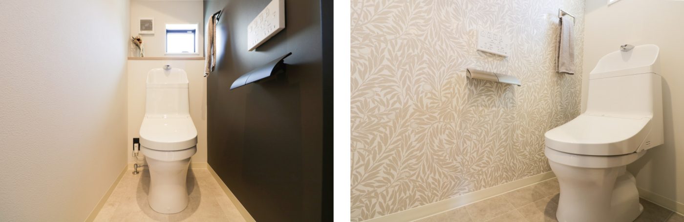 アクセントクロス・クッションフロアに合わせた紙巻き器とタオル掛けのあるトイレスペース。