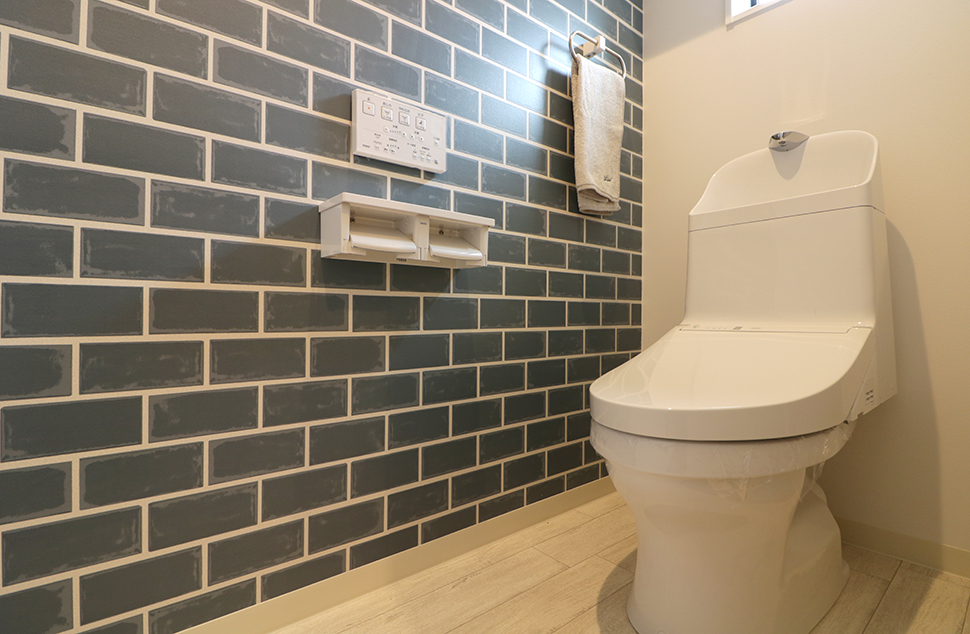 ブルーのタイル調クロスにホワイト木目のクッションフロアを組み合わせて、カリフォルニアテイストに。
