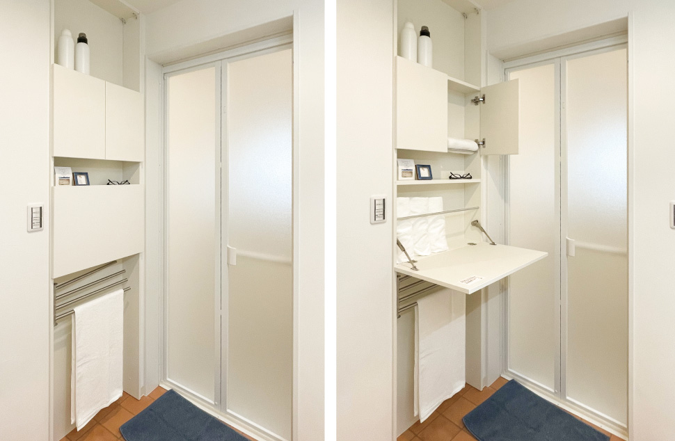 壁厚を活用した埋め込み収納。タオルボックスやタオルハンガーなど、機能性もばっちりです。
