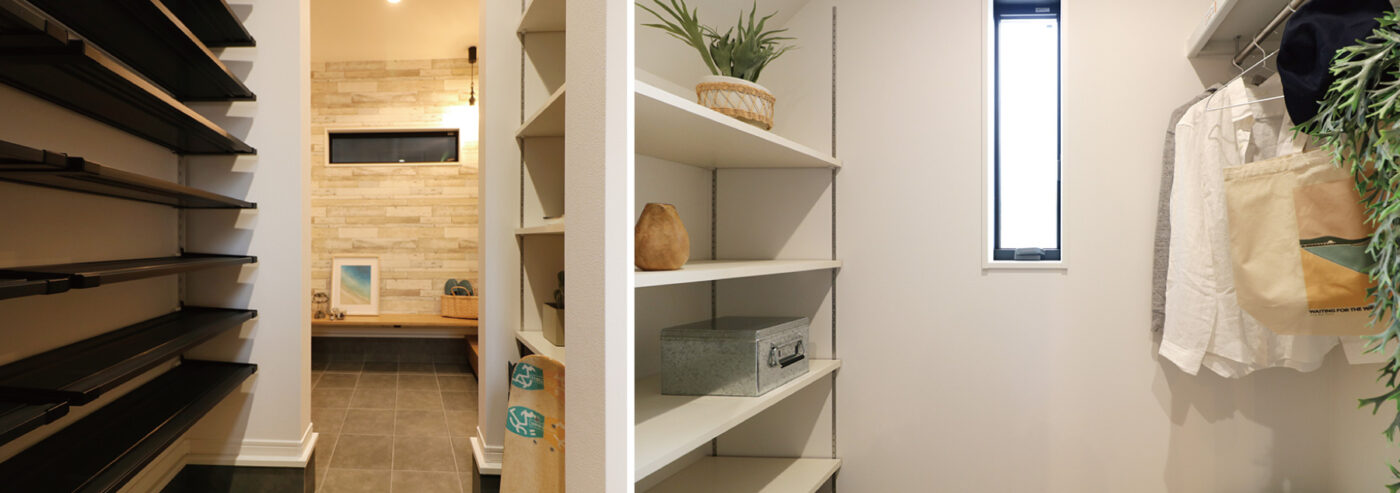 パイプ収納と可動棚があり、収納量も十分に確保。
