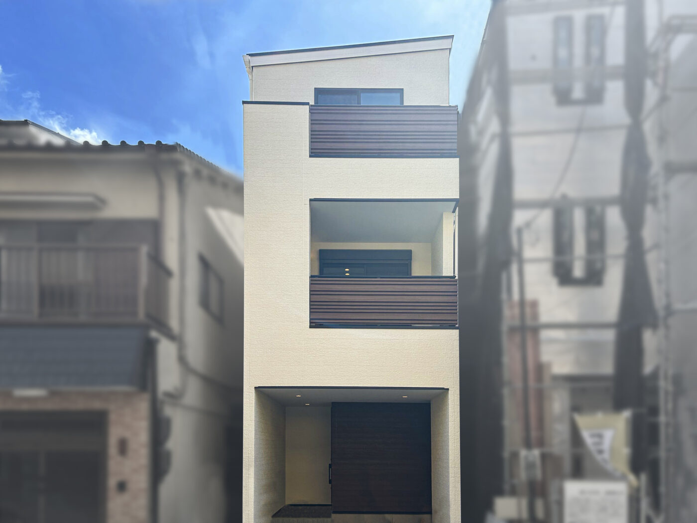 最大2間間口しか建てられない、細長い敷地形状のため、いかに広く・明るく設計できるか工夫を重ねながら設計しました。細長形状のリビングは、開放的で広々とした印象になるよう吹抜けを設け、暗くなりがちな奥のキッチンまで明かりが届くよう計画しています。テレビ上部のコーニス照明で壁面を照らすことにより空間に広がりを与え部屋を広く見せる、などの工夫を施しています。