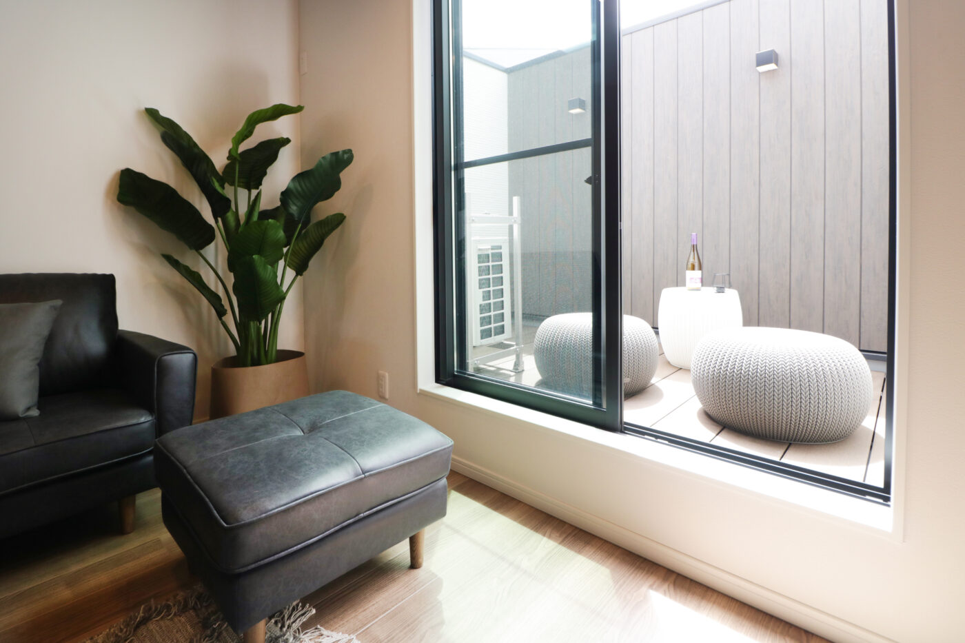 周囲からの視線を気にせず過ごせるように、バルコニー手摺の壁を高く立ち上げ、家の内部からはリビングの延長として感じられるようにした、室内との繋がりもプライバシーも兼ね備えたバルコニースペース。室内から見えるバルコニーの壁は、デッキと同色の木目柄外壁を使用し、バルコニーの奥行をより感じられるようにカラーコーディネートしました。