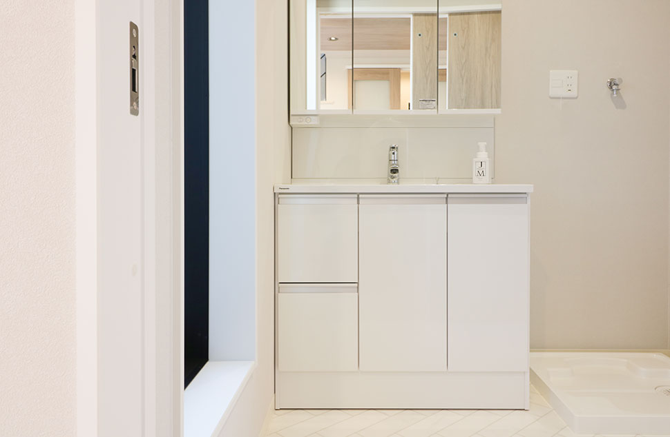 キッチンからアクセスの良い洗面脱衣室には、バルコニーへ出られる勝手口を取り入れて、家事ラクにつながるようにしました。