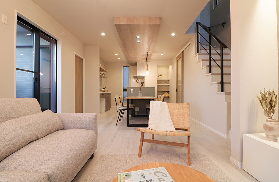 大きな吹抜を設けられなかったり、南面に大きな開口部を設け辛いなどの条件をクリアするために、少しでも広さを感じられるよう天井高を2500mmとしました。内装は、ベースクロスをグレーにし、そこにさまざまなテクスチャーのグレージュ×ホワイトをベースに、差し色で黒を重ね、軽くなりすぎないカジュアルテイストに。