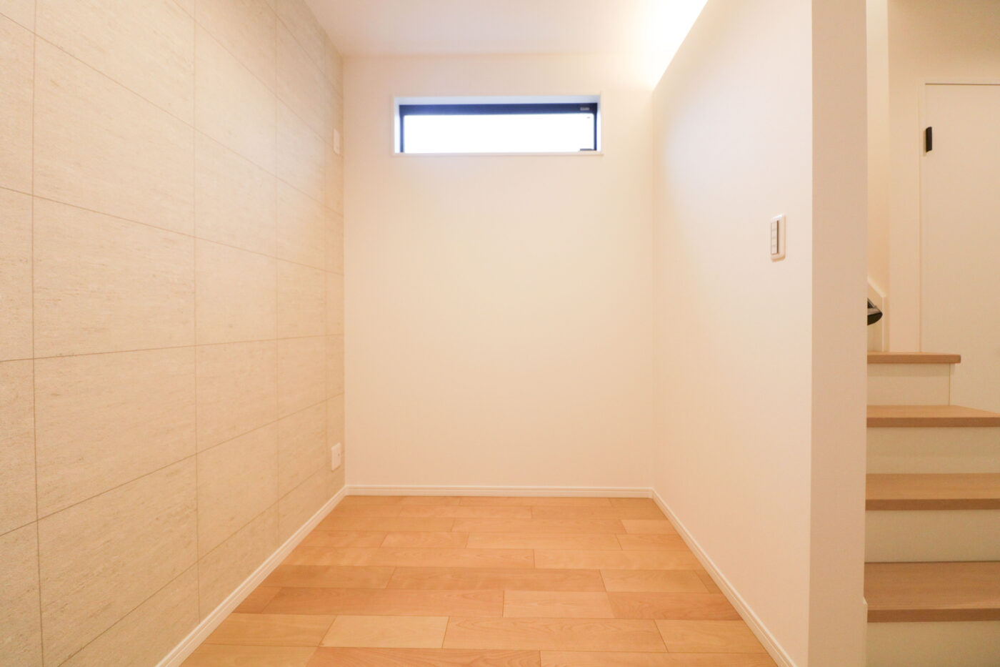 1面のみコンクリートブロック調のクロスを施したフリースペース。壁面に下地をいれているので、壁付け収納を取り付けて書斎や、トレーニングルームなどフレキシブルな空間に。