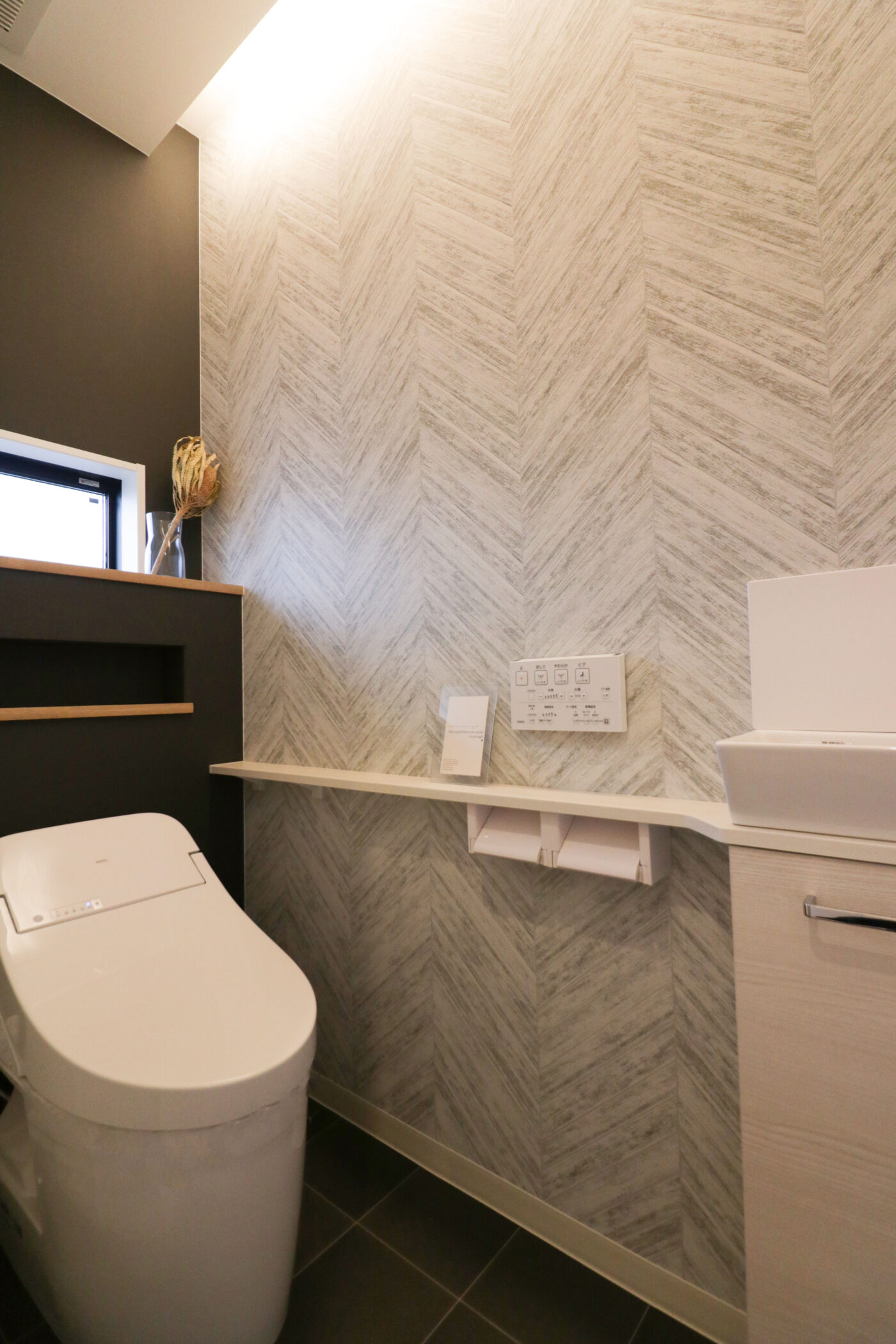 コーブ照明で柔らかい灯のトイレ。グレー色ヘリンボーン調クロスとブラッククロスの組み合わせでホテルライクな空間に。