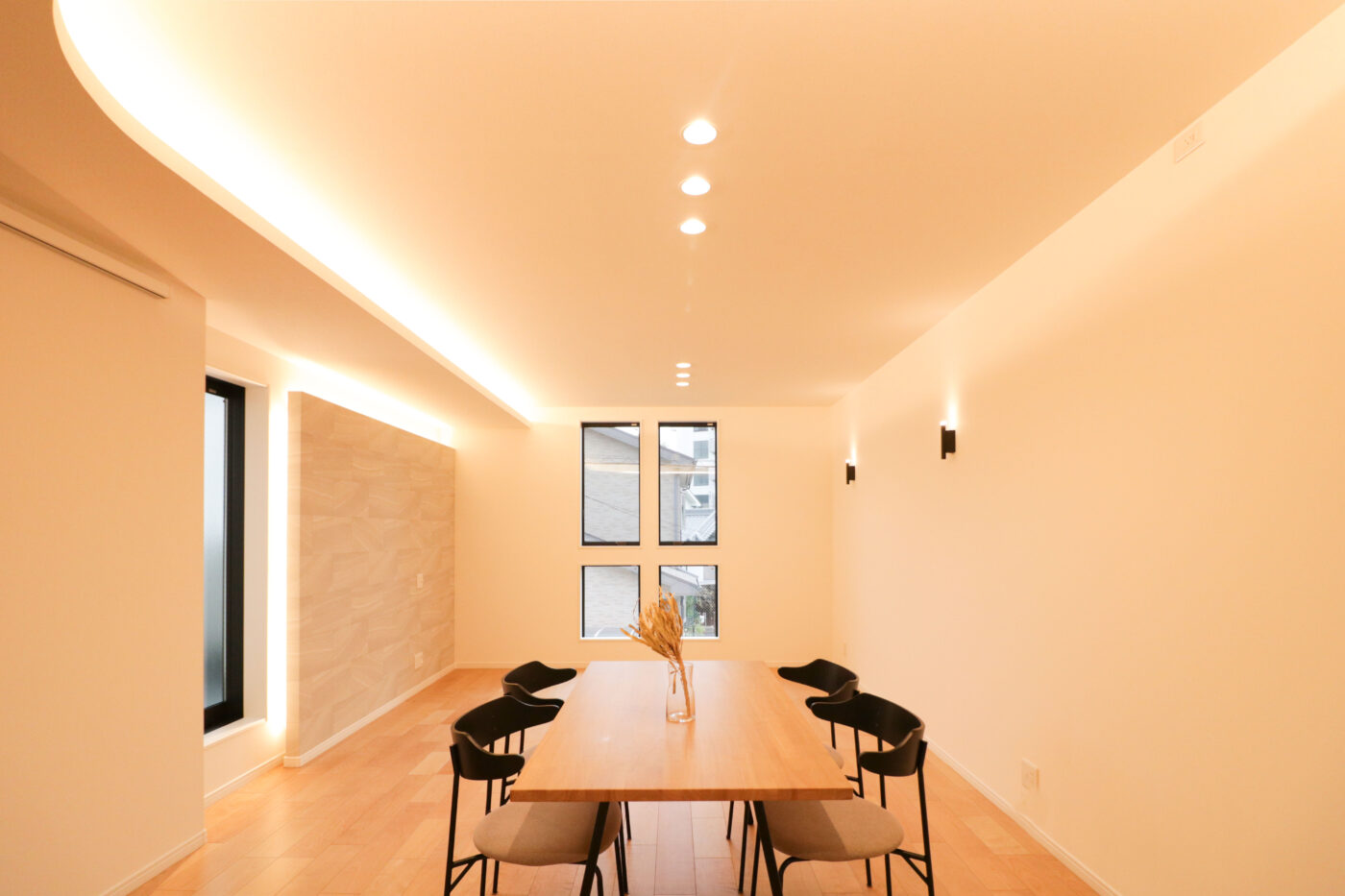 天井や壁の中に光源を隠して照明する「建築化照明」をテーマに、コーブ照明やコーニス照明などを活用し、落ち着きのある空間演出を行いました。「建築化照明」には空間全体を均一に明るくできたり、空間に奥行きができて広がりをあたえたり、お洒落な雰囲気づくりに役立ったりと、暮らしに彩りを与える効果があり、家族がリラックスして過ごせる空間となるよう計画しました。