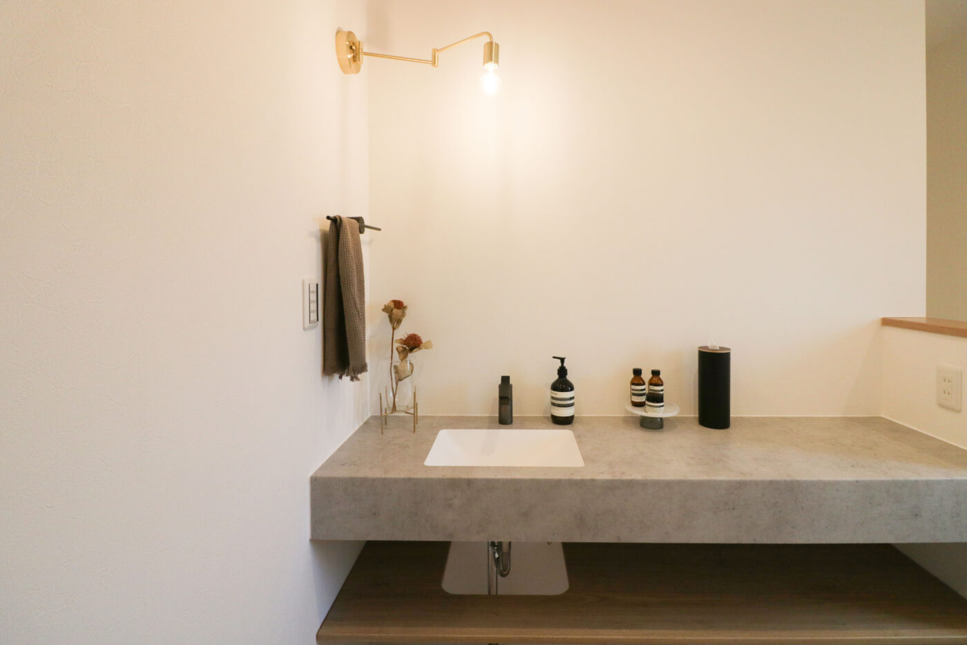 お家に入って正面にある独立洗面台。ゴールドのブラケットライトとオープン棚付1面鏡で意匠性もUPしています。