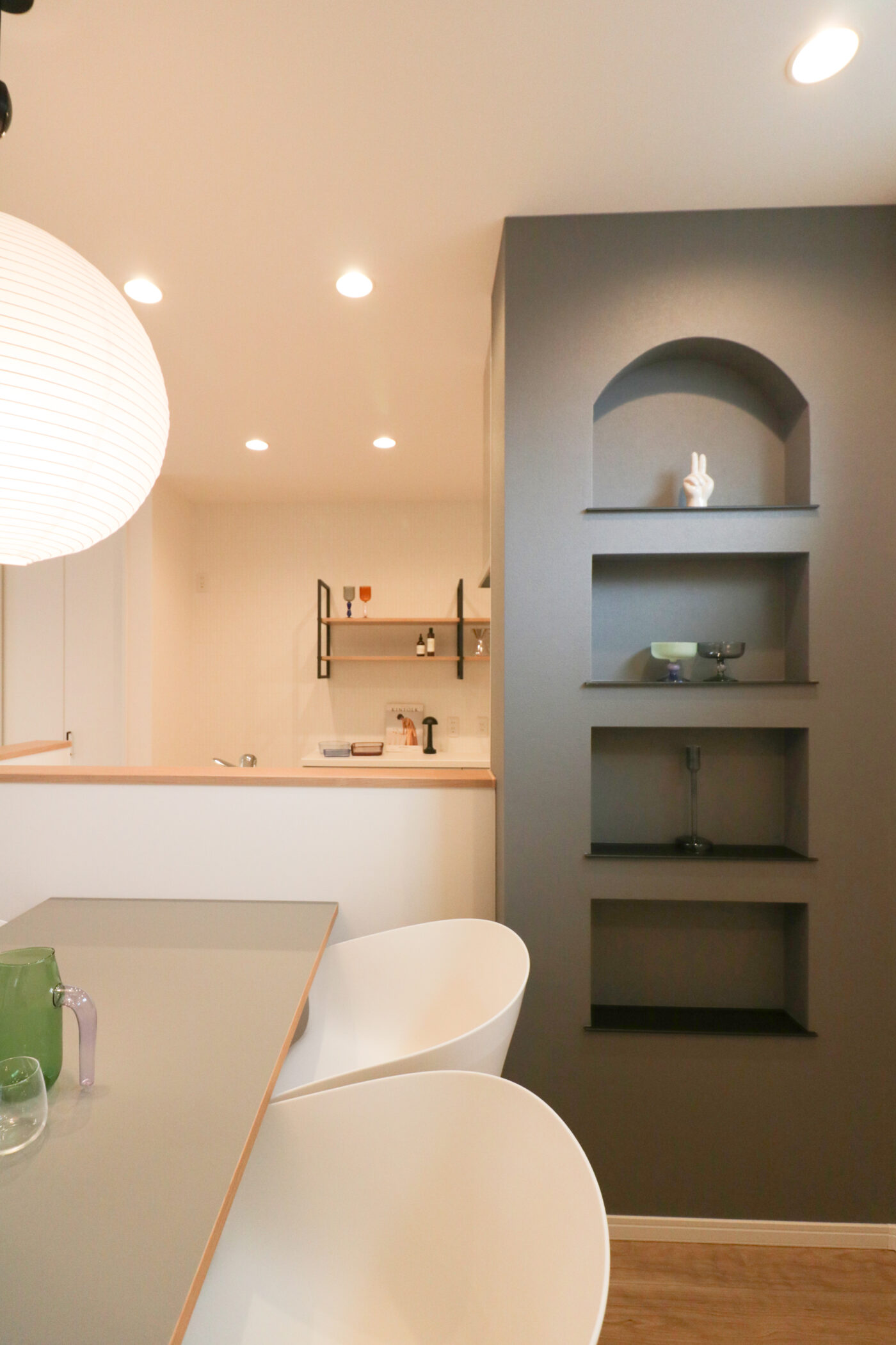 レンジフード裏の壁を180mmふかして作った、形がかわいいニッチ収納。