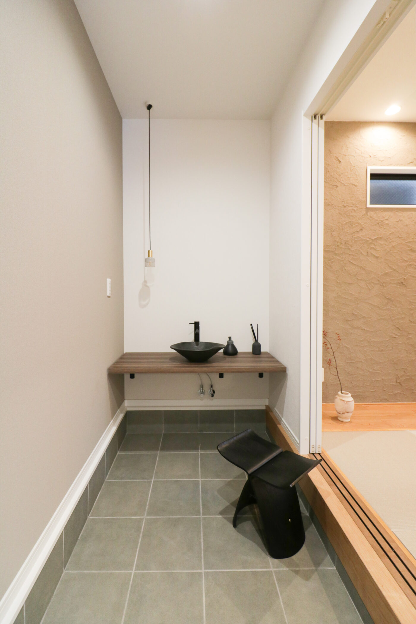 お家に入ってすぐに広がる土間玄関。ブラケットライトを施し意匠性もUPしています。