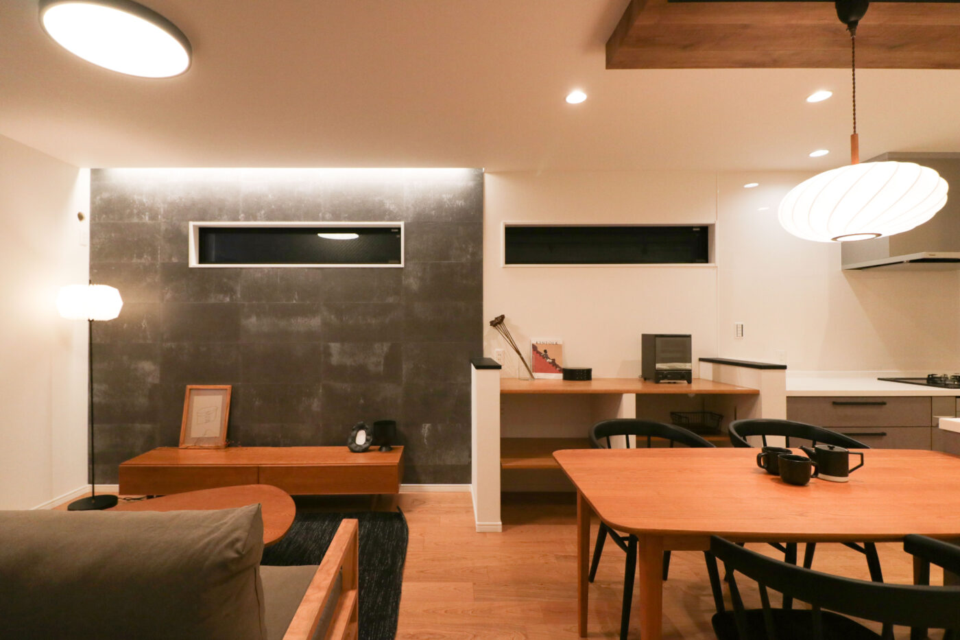 床材と家具をチェリー色でまとめ、タイルや小物などにブラックを取り入れて和モダンを演出したLDK。