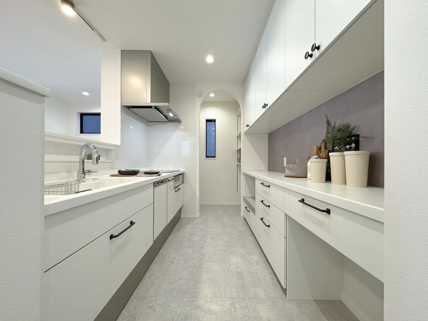白を基調とした、清潔感のあるキッチン。冷蔵庫も収まるパントリー付きで、収納をたっぷり確保しました。