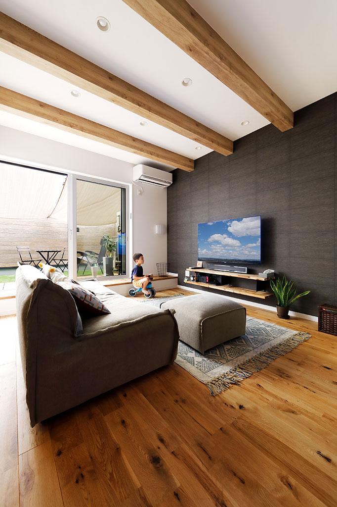天井を少し上げ、梁が頭上を通る開放感あるリビング。