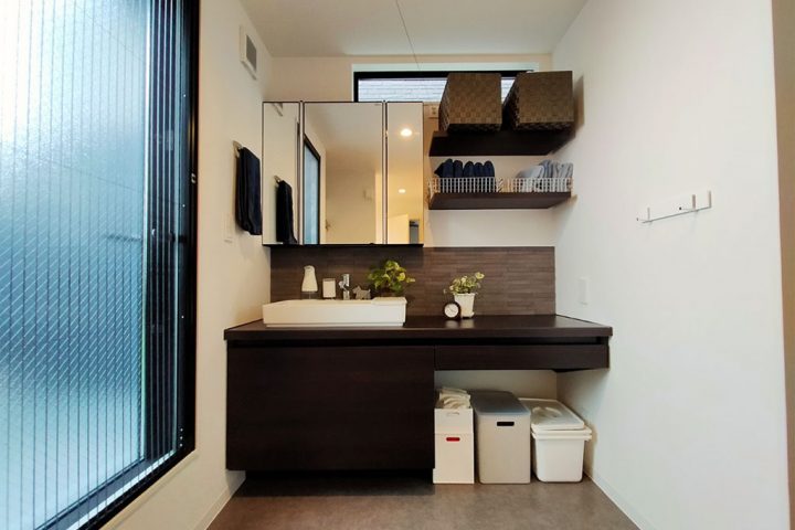 タイル使ったモダンなデザインと、機能を両立させた広い造作洗面台。
