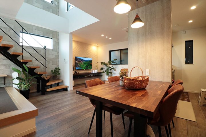 2階に上がると、アイアンを使ったシンボリックな鉄骨階段が出迎えてくれる大人のかっこいいお家が完成しました。南からの光が降り注ぐ開放感ある吹抜けに、リビングには、階段下に設けたタタミコーナー、天井に取り付けたエアコンやスピーカーなどお客様のこだわりがいっぱい詰まっています。間接照明を使い、階段やテレビ背面のタイルに陰影を持たせて居心地の良い住空間になるように計画しました。