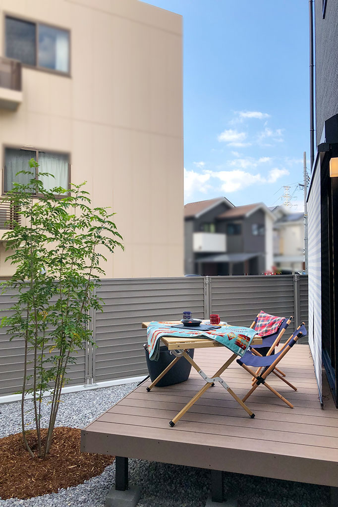 シンボルツリーが映える、リビング横にあるウッドデッキ。敷地にゆとりがあるので、友人を呼んでBBQなどを楽しむことも。