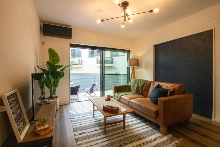 ウッドデッキが空間に奥行きを生み、広がりを感じるリビング。