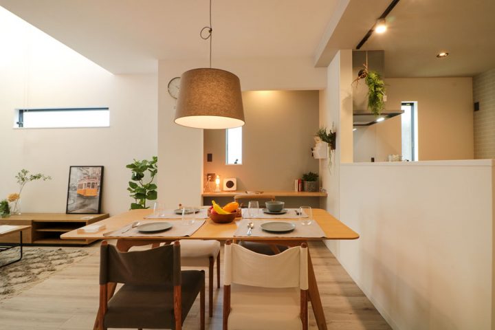 リビング側からは見えない収納棚を設けた、ダイニング横のスタディスペース。垂れ壁×ダウンライトで夜は違った表情を見せてくれます。