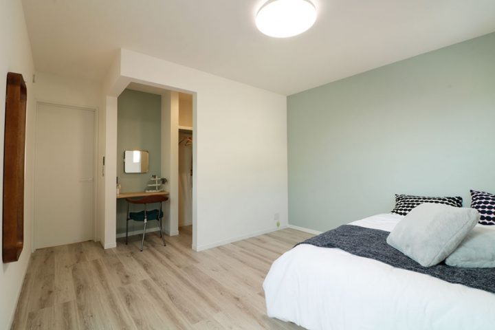 やわらかなブルーのクロスでさわやかな主寝室。垂れ壁でゆるりと区切ったウォークインクローゼット内にはドレッサースペースを設けました。朝の身支度をワンコーナーでシンプルに済ますことができます。