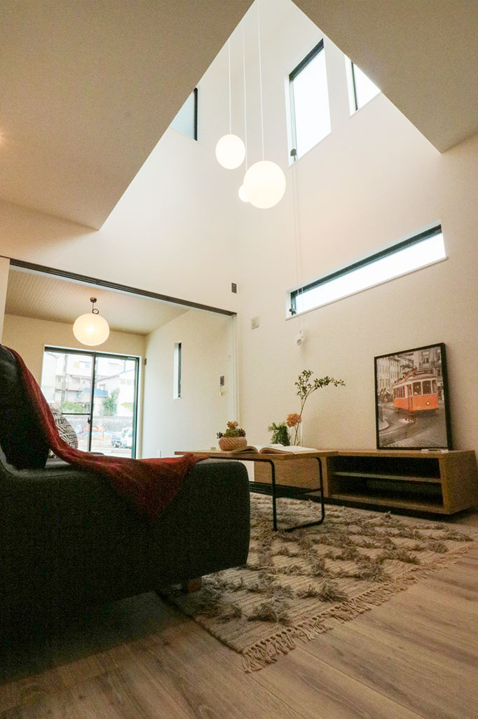 2階のバルコニーを通り、入ってくる柔らかい光が心地よい開放感あるリビング。