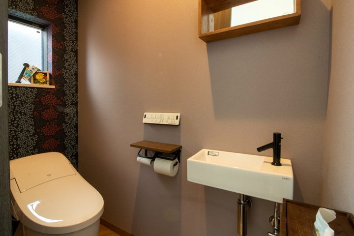 アクセントに使った、花柄のクロスが目をひくトイレスペース。
